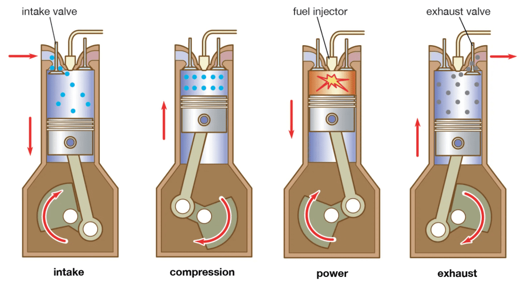 برخلاف موتورهای بنزینی که از جرقه برای احتراق استفاده میکنند، موتورهای دیزلی از حرارت ناشی از فشار بالا برای مشتعلکردن سوخت بهره میبرند. در این موتورها، ابتدا هوا وارد سیلندر شده و فشرده میشود؛ این فشردهسازی شدید باعث میشود دمای هوا بالا رود. سپس سوخت دیزل مستقیماً به داخل سیلندر تزریق میشود که در اثر دمای بالا، خودبهخود مشتعل میشود.