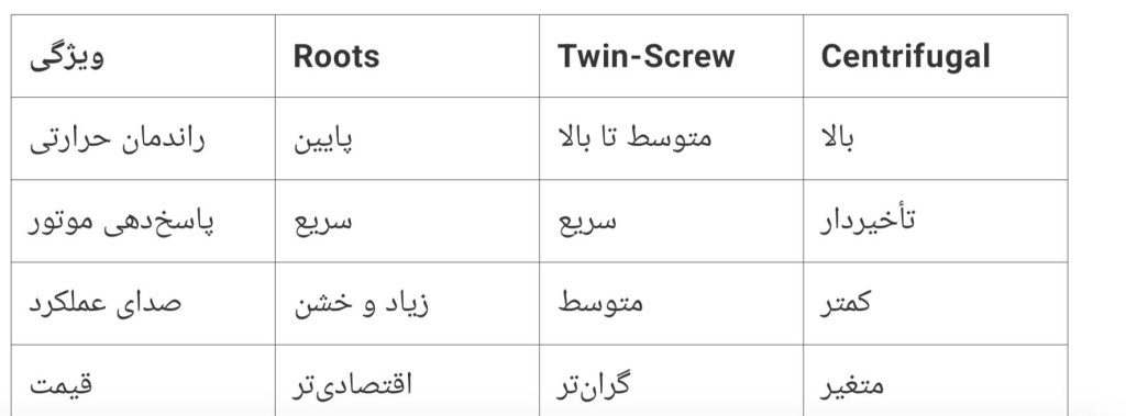 - روتس (Roots Type): قدیمی و قدرتمند، ولی راندمان حرارتی پایین.